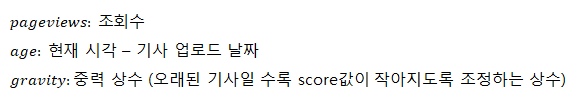 사용자는 뉴스를 볼 때 핫한 이슈이면서도 최근 소식을 보기를 원한다. 따라서, 조회수와 날짜를 조합한 점수를 만들면 사용자에게 최근에 작성된 따끈따끈하고 핫한 뉴스를 추천할 수 있다. 예시로, IT 뉴스 서비스 웹사이트인 'Hacker News'와 소셜 뉴스 웹사이트인 'Reddit'에서 사용하는 뉴스 추천 알고리즘을 소개한다.