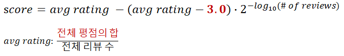 Steam Rating Formula를 1~5점인 영화 평점에 적용해 보면 어떨까? 기준이 되는 점수를 0.5에서 3.0으로 변경하였다. 1에서 5점 사이이므로 가운데 값인 3을 넣었으며, 전체 평점들의 평균이나 중앙값 등을 사용해도 무방하다. avg_rating의 분자를 전체 평점의 합으로 수정했다. 이와 같이 기존 랭킹 알고리즘을 내가 원하는 문제에 맞게 변형하여 사용해보면 좋을 듯하다.