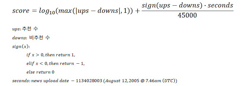 Hacker News Ranking Algorithm이 은 포스팅한지 오래될수록 점수를 낮게 만드는 Age Decaying의 방법을 택했다면, Reddit은 최근의 뉴스일수록 더 높은 점수를 갖도록 한다. 우선 여기서 Seconds란 Reddit의 첫 오픈 일자부터 뉴스 포스팅 일자 사이의 시간(초 단위)을 의미한다. 따라서, 포스팅 일자가 최근일수록 더 높은 값을 가진다. 분모의 45000(초)는 12시간 30분과 같다. Reddit 첫 오픈 일자부터 12시간 30분이 지날때마다 1점씩 추가된다.