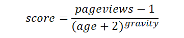[그림2]는 Hacker News의 점수화 알고리즘이다. 분자의 pageviews는 해당 뉴스의 조회수이다. 1을 빼는 이유는 기사 작성자의 조회수를 제거하기 위함이다. 분모의 age는 뉴스 업로드 날짜로부터 현재까지 지난 기간(Hours)를 의미한다 (2는 왜 더해주는지 나와있지 않다.) gravity는 age가 커질수록 분모를 얼마나 더 크게 증가시킬 것인지 설정하는 상수이다. Hacker News에서는 gravity 값을 1.8로 설정한다. 조회수가 높을수록 점수가 높아지지만, 시간이 지남에 따라 오래된 뉴스는 조회수가 높더라도 낮은 점수를 갖게 된다. 그리고 중력 상수가 클수록 시간의 흐름에 더 많은 영향을 받게 된다.