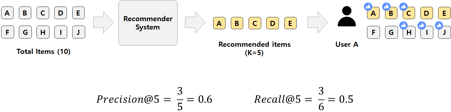 머신러닝 평가 지표로 많이 사용되는 Precision, Recall을 의미하는 것이 맞다. 그런데 뒤에 @K가 붙었다. 기존의 Precision, Recall은 Binary classification에 사용되지만, 추천시스템은 하나의 아이템만 추천하지 않으며 정답도 여러개가 될 수 있다. 따라서 등장한 것이 바로 K다. K는 추천 아이템 수를 의미한다. (뒤에서 소개할 모든 평가 방법의 K는 동일하다.)