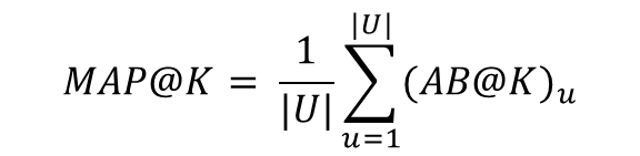 MAP@K는 모든 유저에 대한 Average Precision@K의 평균을 의미한다. U는 User 집합을, |U|는 유저의 수를 나타낸다. [그림2]의 예시에서 총 사용자가 2명이라고 가정하면, 각 User의 AP@K값의 평균을 하면 MAP@K를 구할 수 있다.