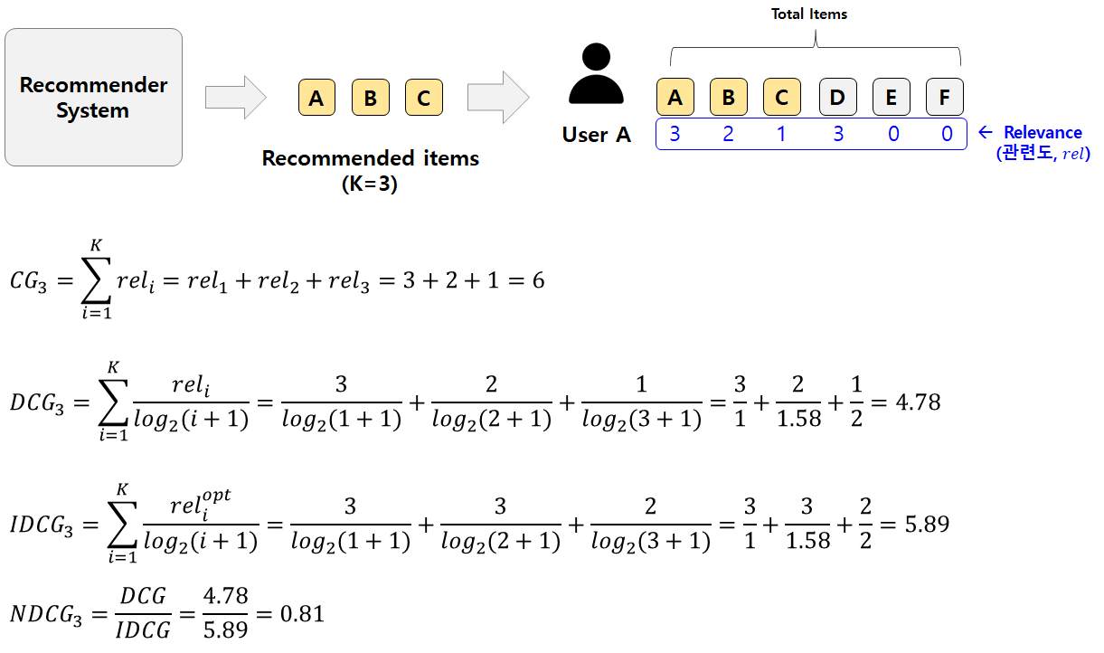 IDCG는 최선의 추천을 했을 때 받는 DCG값이다. IDCG는 모든 추천 아이템 조합 중에 최대 DCG값과 동일하다. [그림4]의 예시에서 가장 이상적인 경우는 Relevance가 높은 순서대로 A(3), D(3), B(2) 이렇게 3개를 추천해주는 것이다. A, D, B를 추천했을 때 DCG값을 구하면 5.89이다.