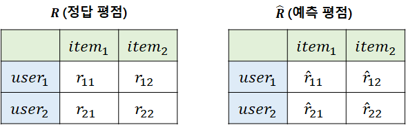 MAE와 RMSE는 앞서 소개한 성능 지표와 달리 '평점 예측'에 대한 평가 방법이다. [그림12]와 같이, 사용자별 아이템에 대한 정답 평점과 예측 평점이 있을 때 두 평점 간 차이를 바탕으로 성능을 평가하는 방법이다.