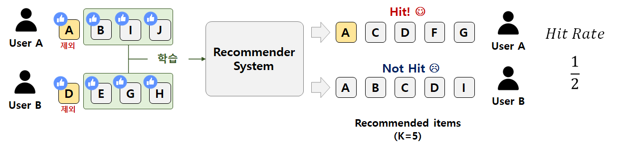 3) 사용자별로 K개의 아이템을 추천하고, 앞서 제외한 아이템이 포함되면 Hit이다.