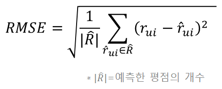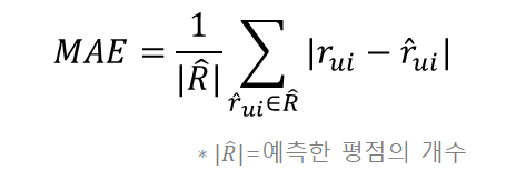 MAE는 정답 평점과 예측 평점 간 절대 오차에 대해서 평균을 낸 것이다. MAE의 장점은 직관적이고 해석이 용이하다는 것이다. 그러나 오차가 큰 이상치에 쉽게 영향을 받는다는 단점이 있다.
