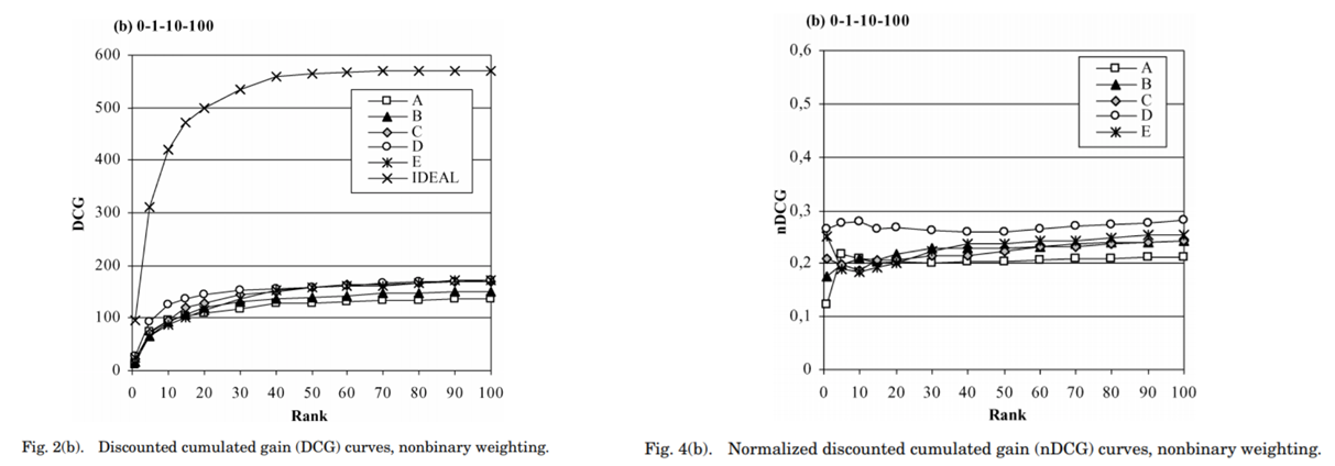 결론적으로, NDCG@K는 가장 이상적인 추천 조합 대비 현재 모델의 추천 리스트가 얼마나 좋은지를 나타내는 지표이다. 그리고 정규화를 함으로써 NDCG는 0~1사이의 값을 가지게 된다. [그림9]는 K(x축, Rank)가 증가함에 따라, DCG과 NDCG가 어떻게 달라지는지 나타낸 그래프이다. 좌측 그래프는 서로 다른 추천 모델(A~E, Ideal)의 DCG값이고, 우측은 NDCG값을 나타낸다. DCG는 K가 증가함에 따라 지속적으로 증가하는 반면, NDCG는 어느정도 K에 독립적이어서 어떤 K가 적절한지 판단이 가능하다. 또한 NDCG가 작은 스케일을 가지기 때문에 비교가 더 용이하다.