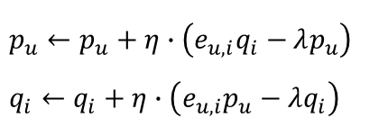 MF에서는 목적함수를 최소화하는 최적화 기법으로 SGD(Stochastic Gradient Descent)를 활용하였다. 파라미터 업데이트를 위해 목적함수를 p와 q로 편미분한다. [그림5]는 MF의 목적함수(L)을 p와 q로 미분하는 과정을 보여준다. 이렇게 편미분으로 도출된 값을 Gradient라고 한다. (자세한 내용은 아래 <더보기>를 참고 바란다.)