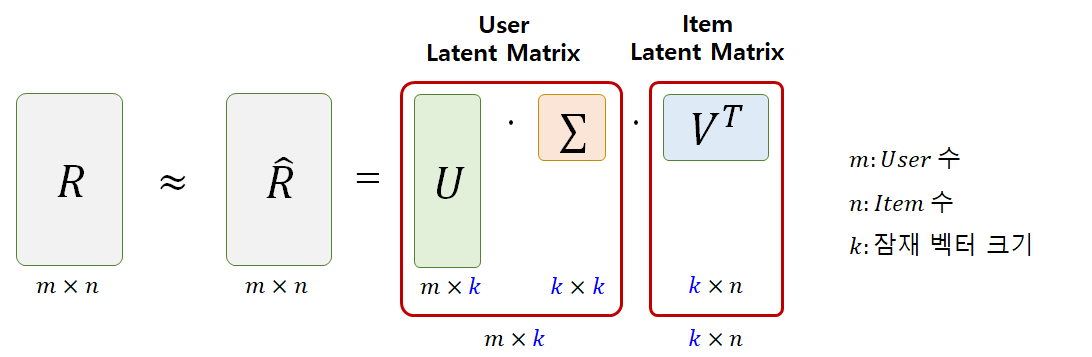 그럼 이제 MF가 SVD를 어떻게 활용하는지 보자. SVD를 하는 대상 행렬 A가 추천 시스템에서는 User-Item Rating 행렬(R)이다. SVD를 하면 3개의 행렬로 분해되는데 이 중에서 첫 번째와 두 번째 행렬을 내적한 것을 하나의 사용자 잠재 행렬로 생각하고, 마지막 세번째 행렬을 아이템 잠재 행렬로 사용한다. 즉, MF에서는 사용자와 아이템 잠재 행렬 두 가지로 분해하여 사용하는 것이다. 이 때, 잠재 행렬 안에 있는 잠재 벡터의 크기는 K이다. P와 Q의 조합으로 User-Item Rating 행렬의 예측값(R_hat)을 구할 수 있다.