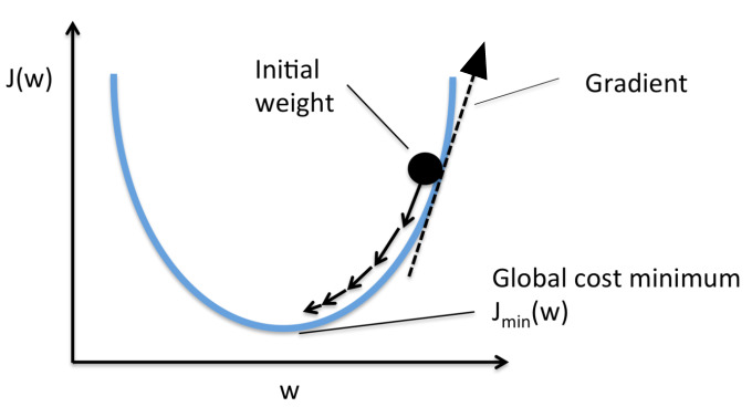 목적함수(J)를 파라미터(w, weight)로 편미분 하면 목적함수에 대한 파라미터의 기울기(Gradient)를 구할 수 있다. 아래 그림에서 볼 수 있듯이 목적함수 값이 클수록 기울기도 가파른 것을 볼 수 있다. 그리고 Gradient는 벡터로 방향도 가지고 있는데 미분값으로 나온 Gradient는 위를 향하고 있다. 그러나 우리는 더 낮은 곳으로 이동해야하므로 기존 파라미터를 업데이트를 할 때 Gradient를 빼줘야 한다.