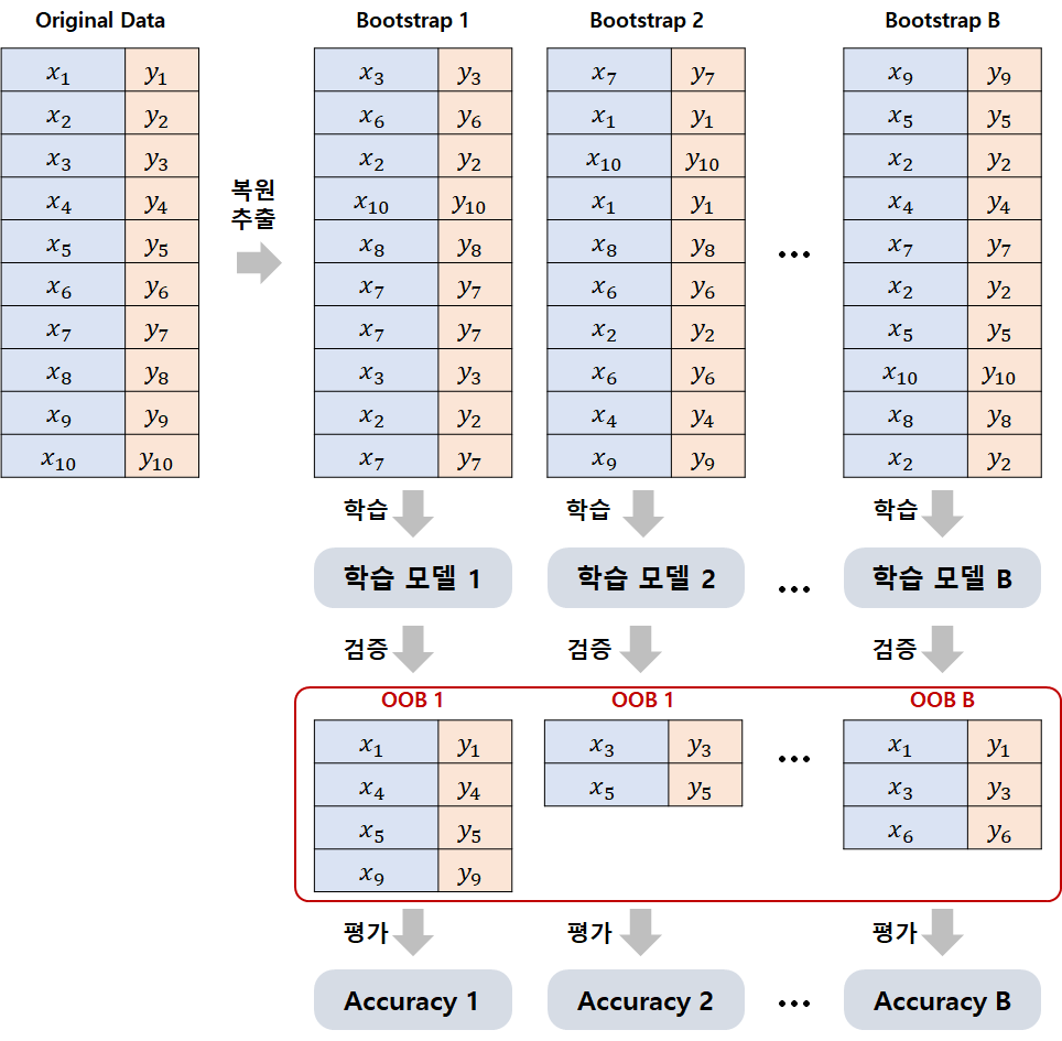[그림 3]의 예시처럼 각 Bootstrap마다 포함된 데이터와 제외된 데이터가 다 다르다. 이 때, 각 Bootstrap별로 포함되지 않은 데이터들의 집합을 OOB(Out of Bag) 데이터라고 부른다. OOB 데이터는 Bootstrap을 기반으로 학습한 모델의 Validation을 위한 데이터셋으로 사용된다. 충분히 많은 Bootstrap을 활용하면, 주어진 데이터를 모두 한번 이상씩 검증용으로 활용함으로써 k-fold validation 더 높은 일반화 성능을 확보할 수 있다.