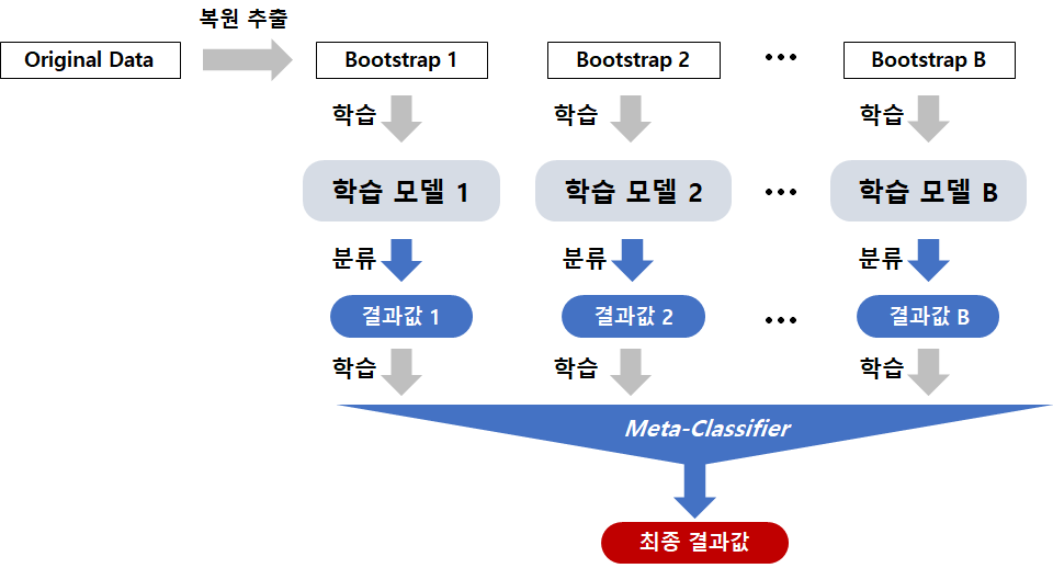 Stacking은 개별 모델들의 분류값(결과값)을 입력으로 받아서 최종 결과값을 출력하는 학습 모델(Meta-Classifier)을 하나 더 만드는 것이다.